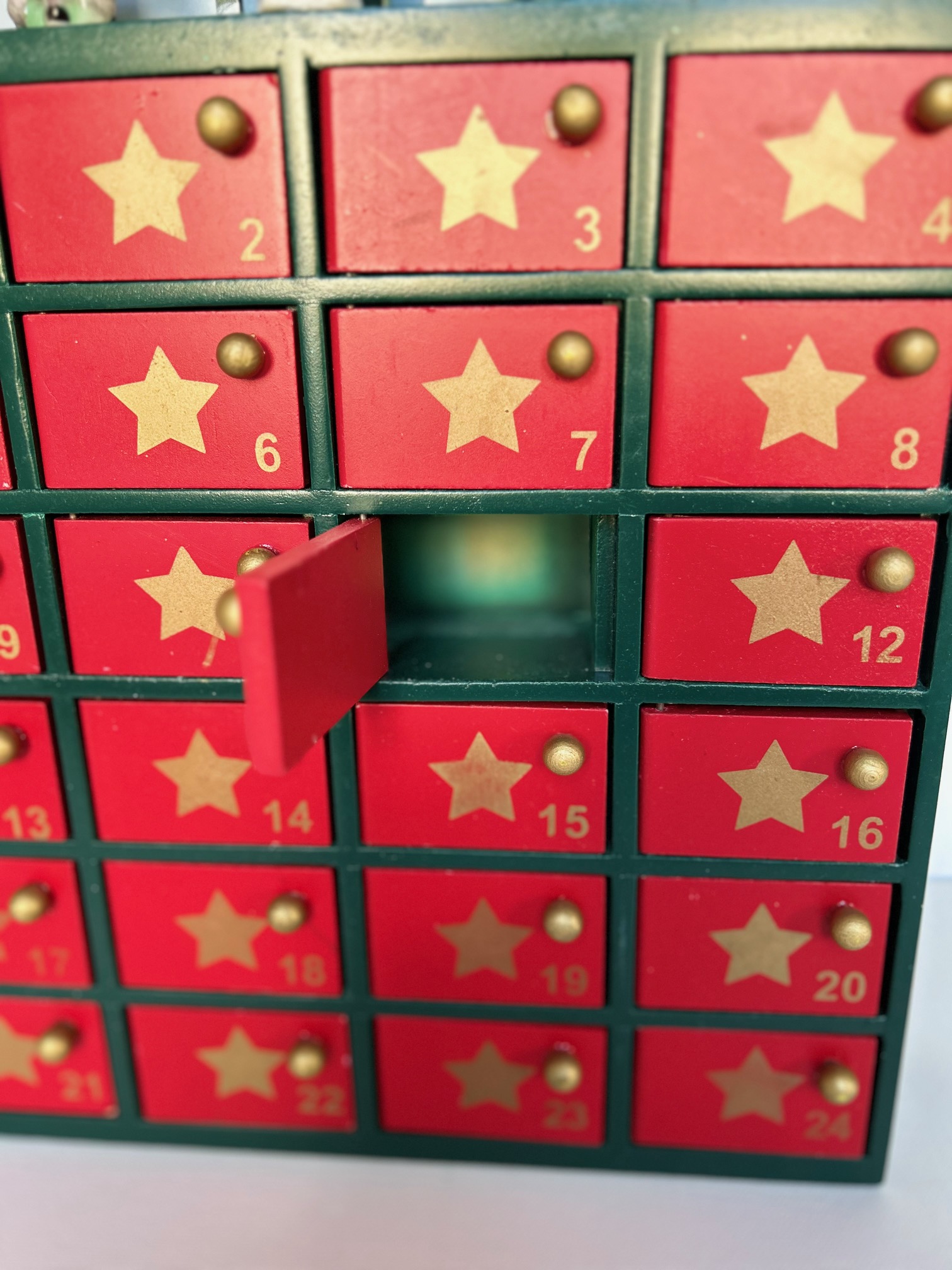 Les 24 cases sont vides et s’ouvrent par une petite porte munie d’un bouton.