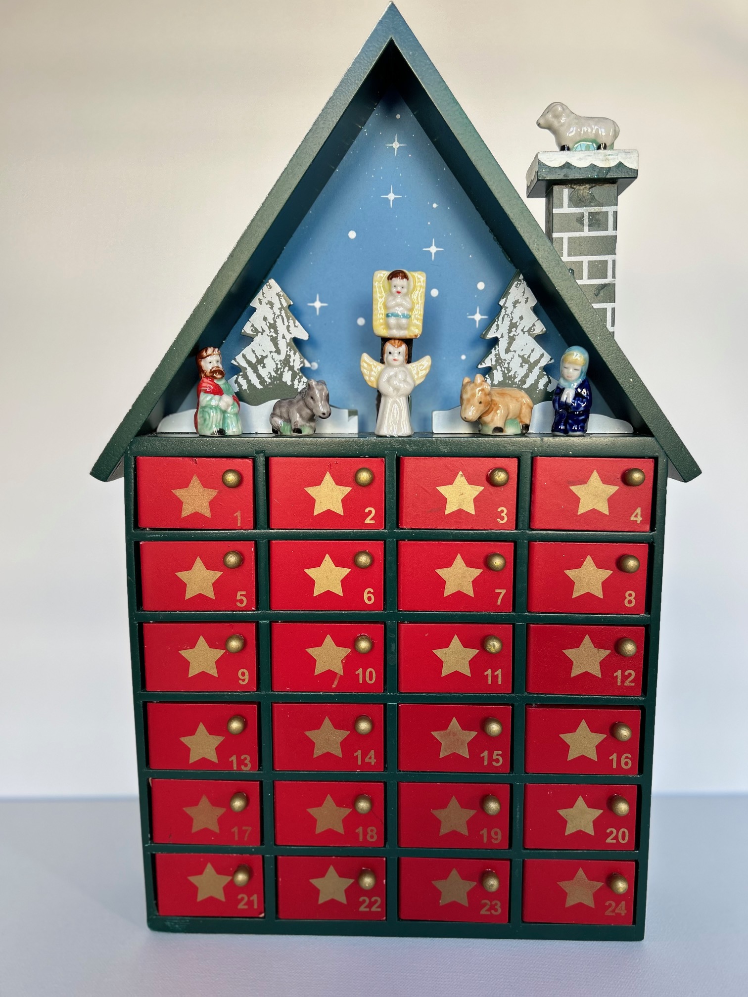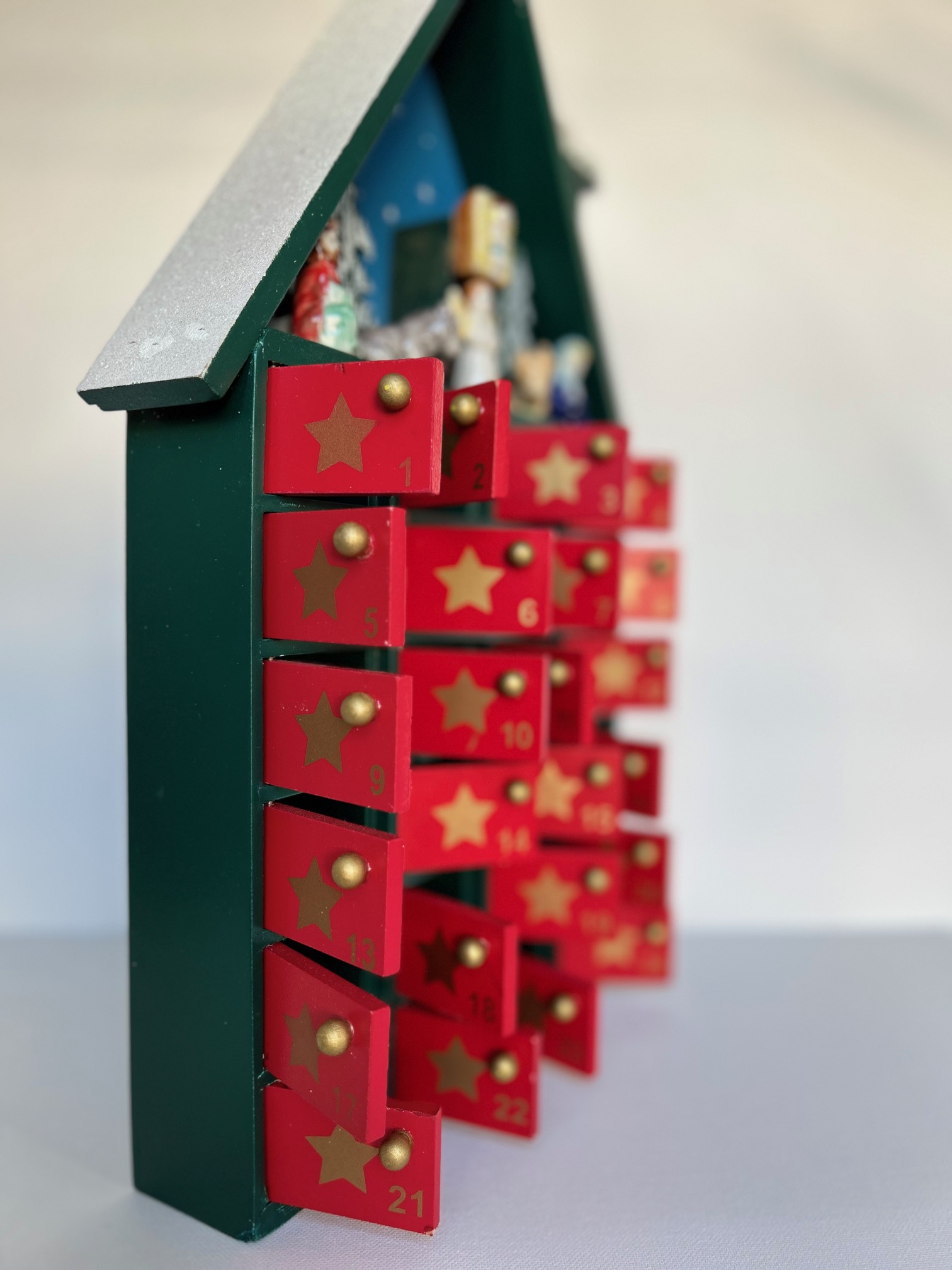 La structure de la maison est en bois peinte et peut présenter des imperfections, ce sont des calendriers de l’avent chinés puis transformés, ce qui fait tout leur charme.