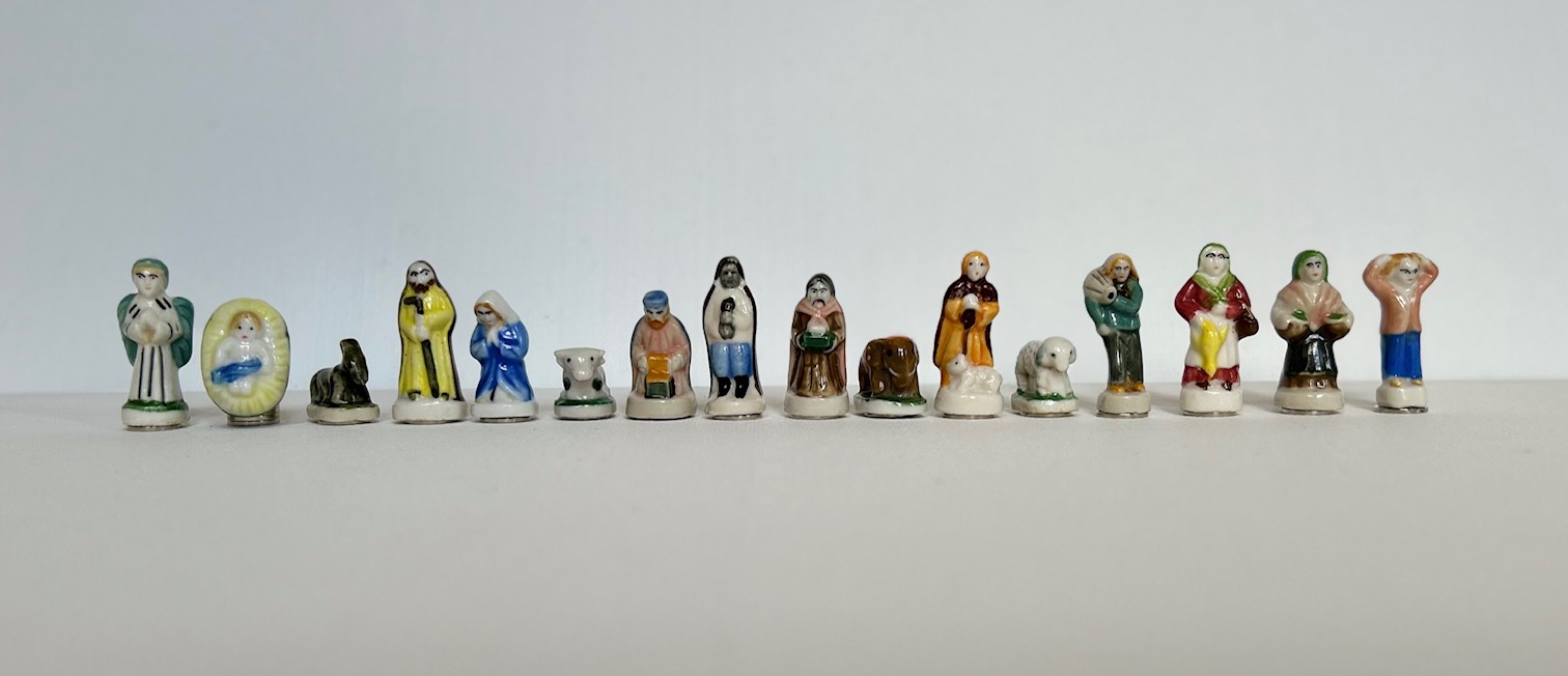- Les santons sont des fèves de galette, chinées et triées pour reconstituer autant que possible la série complète d’origine.